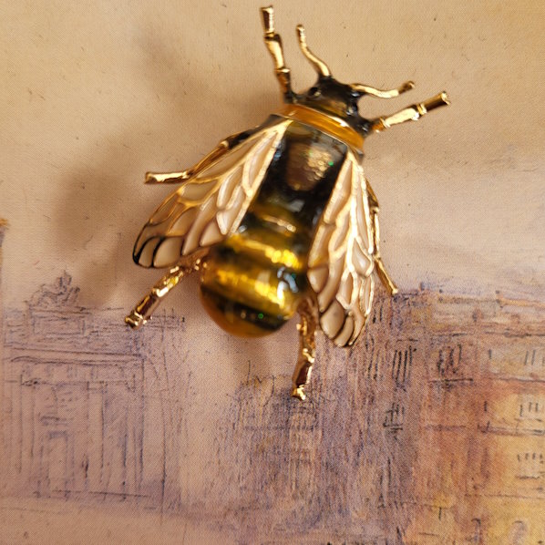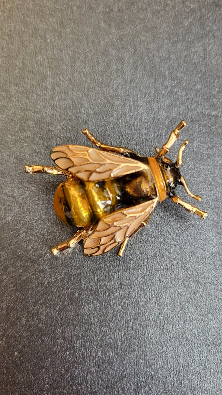 Unique, costume jewellery piece, made from a resin body & enamel wings. Set on a gold coloured metal cast.
